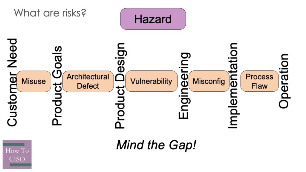 Most of the time, when someone uses risk as a noun (“a risk”), what they’re talking about is a hazard: a danger present in the environment which helps create a path to an unacceptable outcome. Hazards can often be considered as a gap between what you expect, and what you were given. This gap-focused definition yields different names depending on where the gap occurs.
