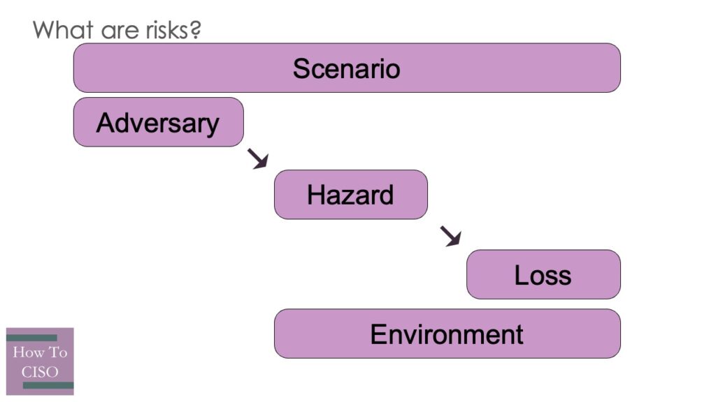 To some, risks are hazards – vulnerabilities that are present in a complex system that an adversary, with or without intent, could exploit or trigger to cause you harm. To others, risks are scenarios, encompassing both a set of hazards and the exploit or trigger (so a single hazard risk maps to multiple risk scenarios). Maybe someone views risks as adversaries, the triggers that cause harm to come to the company. Risk might apply to an environment, a collection of systems that have an aggregate risk.For some, risk might be seen as a cost, the downside to a plan for the future. Every executive you interact with has a different definition of risk, and it’s near impossible to teach them to use your definition.