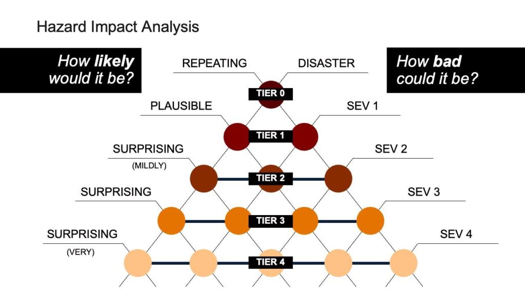 Tier 1 risks encompass two categories: Repeating Sev1, and Unsurprising Disasters. Often, a given hazard will have scenarios in both locations: a hazard being repeatedly triggered to create Sev1 incidents at a notable cadence likely has a nearby scenario in which it can be triggered for far greater harm. This concept repeats across all Tiers, and leads to one of the strengths of the Pyramid of Pain: it doesn’t attempt to prioritize within a Tier. All Tier 1 risks are problematic for a business, and should be dealt with urgently. If the scenarios for a hazard clearly fall into this tier, rarely is deeper conversation warranted about prioritization.