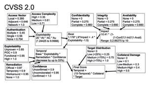 CVSS was designed to score a very specific type of hazard: vulnerabilities in third-party software. CVSS originated in 2004 by NIST and FIRST, and has had four major versions. CVSS scores a vulnerability with three sub-formulas: the base score describing intrinsic risks to systems that have the vulnerability (How hard is this to exploit? What level of system compromise does this result in?), a temporal score evaluating factors that change globally over time (Is there an exploit in the wild? Is there a patch?), and an environmental score mapping the vulnerability into a specific environment (how valuable is the system in your environment? How many systems do you have that are vulnerable?). Each of these scores is calculated by taking some qualitative inputs, giving those numeric values, and calculating them in a complex formula that outputs a score from 0.00 to 10.00. Below you can see how this was calculated for CVSS 2.0. CVSS 4.0 “simplified” this by having the initial qualitative scores combined through a set of logic gates, and then having a lookup table based on those results.