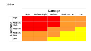 In practice, a nine-box is often really a five-box: any placement in the four corners we tend to believe, but any item with a Medium score on axis is confusing – is it really a Medium, or was it a borderline High that you don’t feel like you can convince others of? Maybe you end up in long arguments with peers about risks that are right on the border – the damage isn’t as “High” as the worst scenarios, but it’s scarier than most of what’s in Medium.